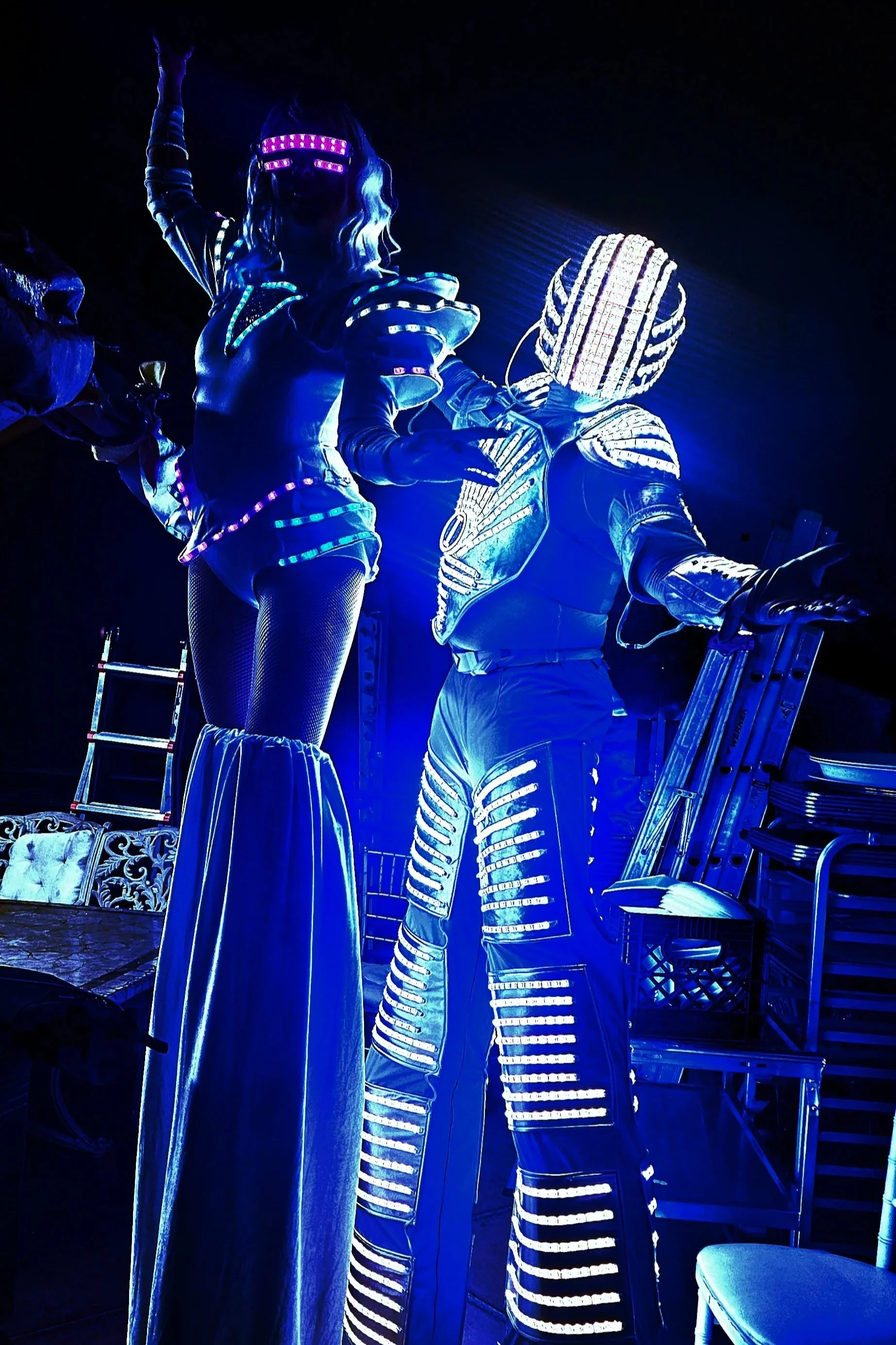 Looking to add some sparkle to the night? Add our Mirror Dancers and Stilt Performers to your event. Our Mirror performers add a unique Disco vibe to any occasion.